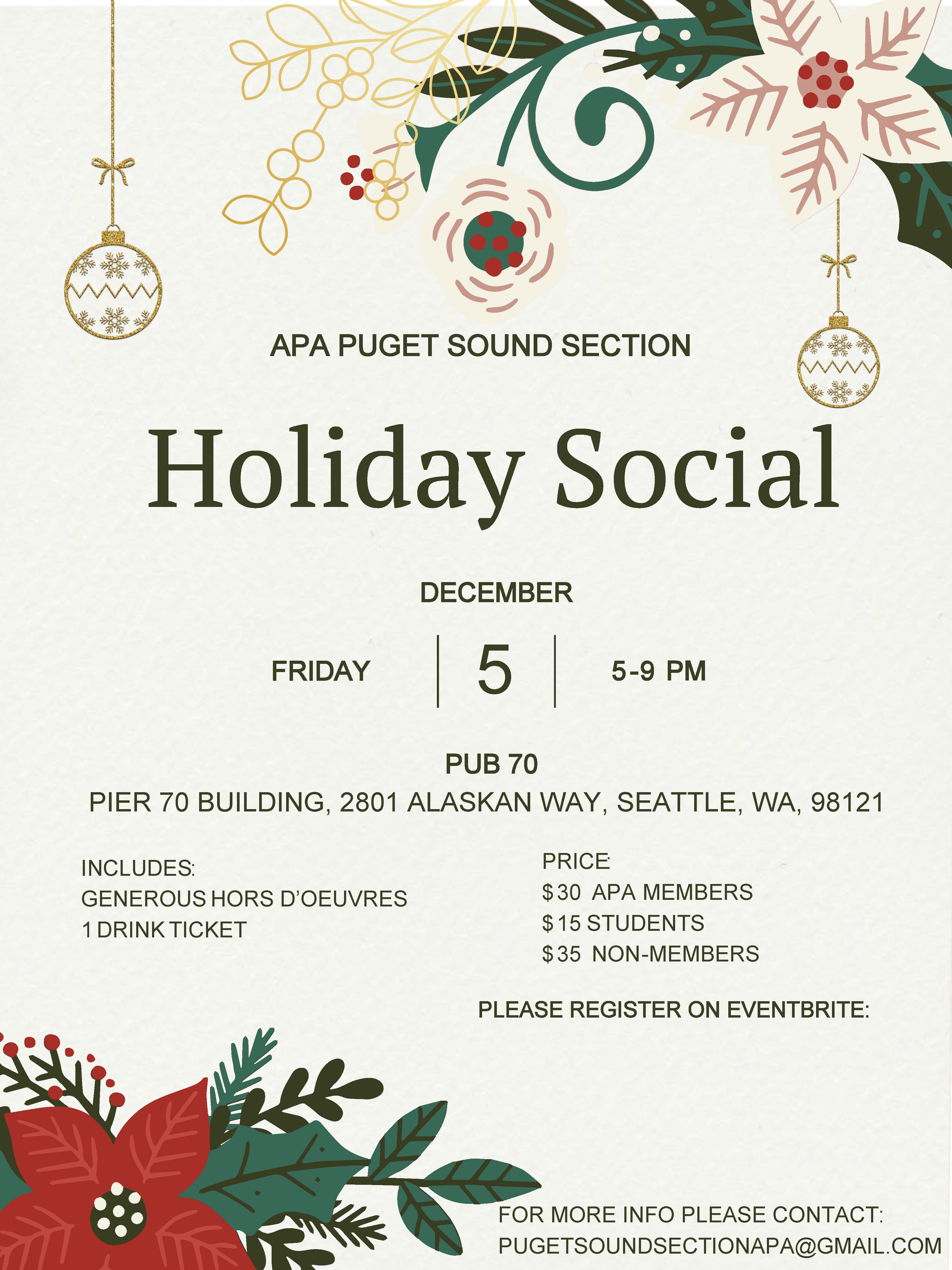 • Friday, December 5, 2025, 5-9 pm | APA Puget Sound Section Holiday Party at Pub 70 (2801 Alaskan Way) $30 for APA Members, $15 for Students, $35 for non-members